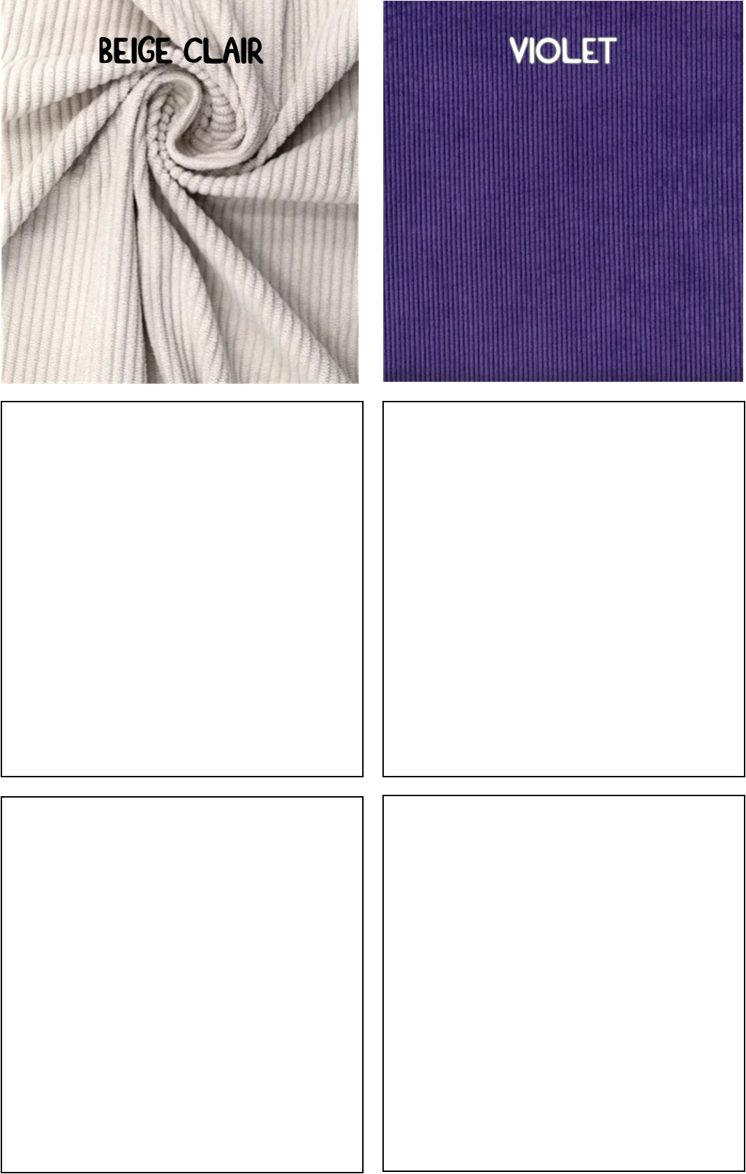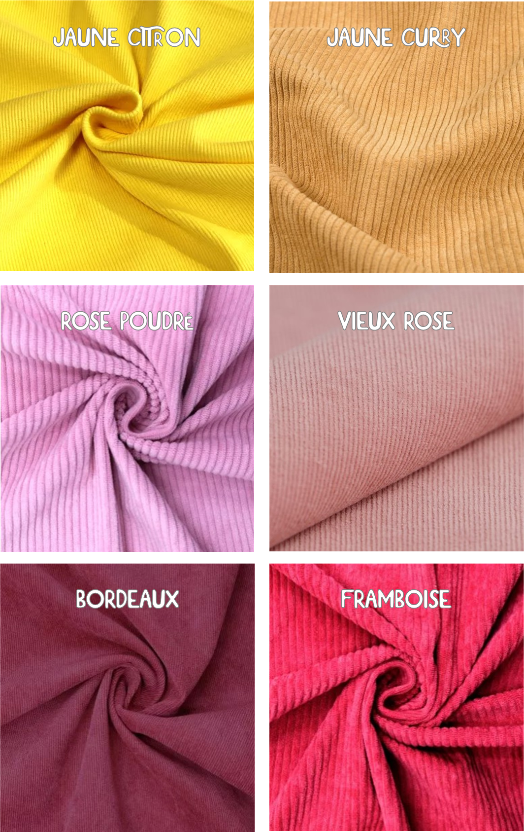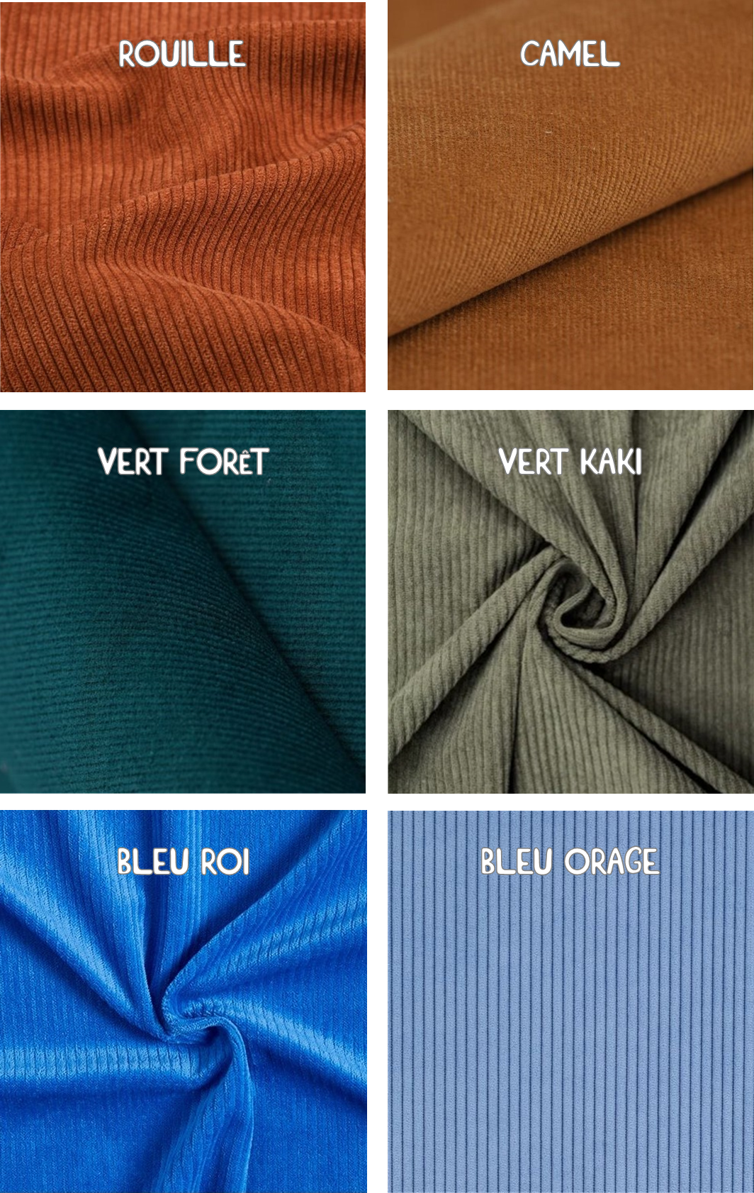 Beige clair, Bleu orage, Bleu roi, Bordeaux, Camel, Framboise, Jaune citron, Jaune curry, Rouille, Vert forêt, Vert kaki, Vieux Rose, Violet
